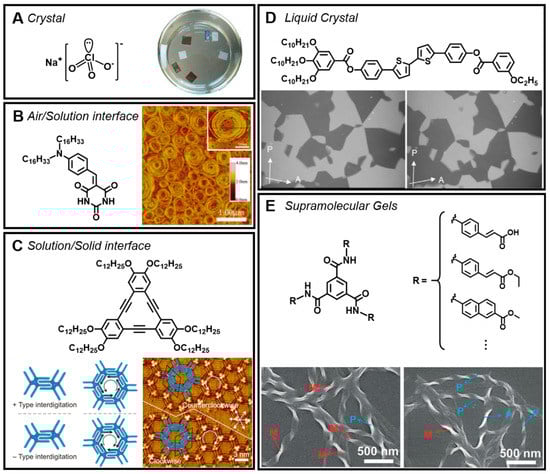 Over the past two decades, spontaneous symmetry breaking has been found in various self-assembly systems including crystals [24,25,26], Langmuir monolayers [27,28,29], liquid/solid interface [30,31,32], liquid crystals [33,34,35,36,37], dye aggregates [14,16,38,39], amphiphilic assemblies [40,41], and supramolecular gels [42,43,44,45,46,47]. Figure 1 illustrates some typical examples in these field. One chiral crystal that has been investigated in detail is tartrate [48]. During crystallization process, two kinds of chiral crystals with almost identical physical properties can be formed. However, the plane of polarization rotates are different when linearly polarized light (LPL) passes through these chiral crystals. It should be noticed that their optical activity maintains when these crystals are dissolved in water. However, another well-studied crystal with chirality in solid, named as sodium chlorate (NaClO3), behaves quite differently, as it displays optical activity in crystal state (Figure 1A), but the optical properties disappears when the crystal totally dissolves in solution [49,50]. It is known that a crystal exists in a molecular or ion state in solution. Therefore, the above phenomenon suggests that ions of tartrate molecules are chiral. Conversely, the ions of the NaClO3 molecule are achiral. This is one typical example of symmetry breaking in crystal systems, and thereafter many achiral molecules have been found to be chiral in crystals [51,52,53,54,55].