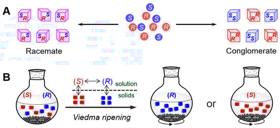 It is worth noting that applying stirring during crystallization is usually effective to break the symmetry, leading to a high enantiomeric excess of the resulting crystal [25,111,112]. In 2005, Viedma demonstrated that the initially racemic mixture of NaClO3 crystals could completely transform into one chiral form over a period of several days (Figure 3B) [113]. Remarkably, the completely transformation means that the whole system achieves homochirality although the final handedness could not control. This transformation process, which is now called Viedma ripening, involves the deracemization of solid-to-solid and solution-to-solid [114,115]. The novelty of Viedma’s experiment lies in the addition of glass beads and magnetic bar during deracemization. The glass beads enhanced the grind of crystals, resulting in numerous small fragments with the identified handedness. Therefore, the homochirality is achieved by applying stir and grind for a period of time. It should be noted that the chiral bias can be controlled by crystal enantiomeric excess [113]. For example, solutions with initial 5% L-crystal enantiomeric excess give rise to 100% L-type crystals, and vice versa. Since that, this method was successfully extended to many crystal systems, and even organic reaction which contains crystal products. Very recently, Viedma ripening found broad applicability [18,116,117,118,119,120,121,122]. Without grinding treatment, a temperature gradient which involves several cycles of rapid heating and slow cooling could also realize the deracemization [123,124].