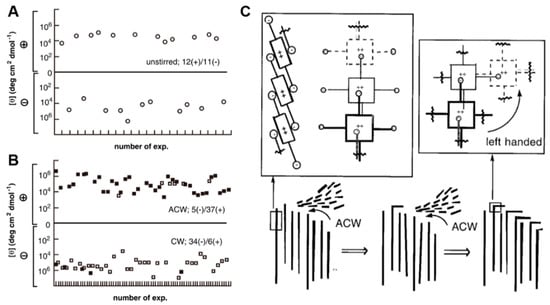Clearly, the randomly distributed chiral signals indicates that the unstirred experiments belong to a pure symmetry breaking process (Figure 4A). However, as shown in Figure 4B, the chiral selection was dependent on the rotation direction when the samples were applied rotary evaporation treatment. The statistical distribution indicated that 85% of the chiral signals could be controlled by the rotation direction, suggesting a biased symmetry breaking (Figure 4B). Due to the existence of anionic sulfonato groups and the positively charged porphyrin rings, the J-aggregation was achieved by the intermolecular electrostatic and hydrogen bonding interactions. Therefore, the arrangements of achiral porphyrins with different angles are indeed possible (Figure 4C). The schematic illustration shows that the chirality may be transferred from the macroscopic chiral force to the electronic distribution. After this report, the acting chiral hydrodynamic shear force during rotatory evaporation were theoretically investigated, and similar conclusions has been obtained in other type of vortices [126,127,128,129].