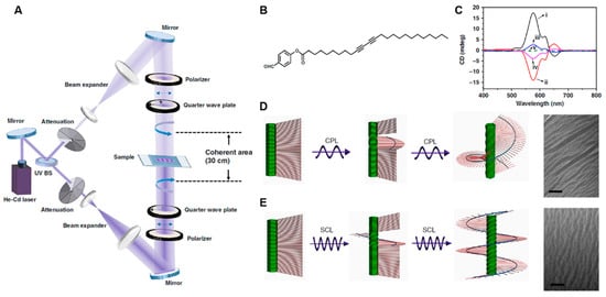 Figure 5A shows the experimental set-up for the generation of SCL from two CPL beams (325 nm) [144]. Clearly, compared with the conventional CPL, the achiral benzaldehyde-functionalized diacetylene (Figure 5B) LB films that irradiated by the SCL exhibited a stronger CD signal. In contrast, if the sample was polymerized by LPL, no signal was observed from the CD measurement (Figure 5C). As a result of the enhanced optical dissymmetry, the polydiacetylene films achieved in SCL field shows nearly 5-fold enhancement in dissymmetry factor. As illustrated in Figure 5D,E, compared with CPL irradiation, the enhanced optical dissymmetry in SCL may lead to more helical polydiacetylene (PDA) chains, thus resulting in an increased dissymmetry factor of PDA films. In addition, transmission electron microscopy (TEM) images also demonstrated that samples polymerized by SCL have more helical PDA chains than those polymerized with CPL [144].