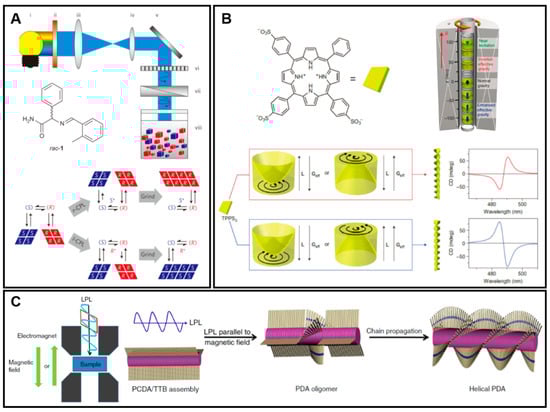 Although all of the above approaches can be used alone to select the supramolecular chirality, not all of them are effective, due to their own limitations. In fact, a large number of reports employed more than one treatment to control the chirality of symmetry breaking [145]. For example, as shown in Figure 6A, Vlieg et al. demonstrated that the CPL irradiation caused symmetry breaking of an amino acid derivative could be amplified by a grinding process [146]. Specifically, a solid–liquid mixture was firstly irradiated with L- or R-CPL for 70 h (0.3 mW intensity). Thereafter, the slurry was grinded with a magnetic stirring bar and glass beads. In addition, organic base such as 1,8-diazabicyclo [5.4.0] undec-7-ene (DBU) was added in order to induce the racemization in solution. Five days later, the final chirality of enantiopure solid was found to be selected by the handedness of CPL. From the above description, it can be concluded that a non-racemizable chiral photoproduct may be formed under the effect of the CPL irradiation, while the subsequent grind treatment amplified the small initial chirality [146].