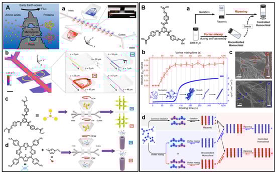 (A) Schematic hypothesis of the origin of supramolecular chirality in nature. (a) The imitated microvortices that generated by the microfluidic device. (b) computational fluid dynamics (CFD) simulation of the chiral microvortices. Formation of chiral supramolecular assemblies of achiral (c) (tris (ethyl cinnamate) benzene-1,3,5-tricarboxamide (BTAC) and (d) tetraphenylporphyrin (TPPS4) and C2mim+ ionic stabilizer within the microvortices. Reprinted with permission from ref. [93]. (B) Vortex mixing-accompanied self-assembly induced homochiral supramolecular assemblies from exclusively achiral molecules. (a) Schematic illustration of the procedures towards homochirality. (b) Red curve: the absolute dissymmetry factors (gCD) of the samples prepared with different vortex times; blue curve: the correlation between the absorption data and cooling time. (c) SEM images of the helical structures after vortex mixing. (d) Schematic illustration of the mechanism towards homochirality. Reprinted with permission from ref. [67].