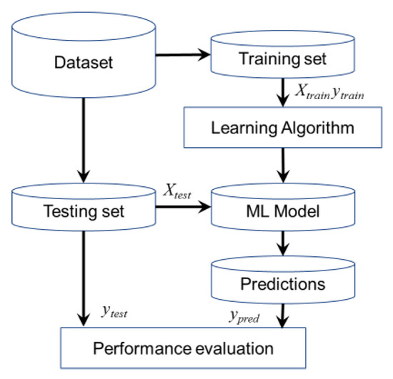 Figure 1 shows the typical implementation flow of machine learning (ML) algorithms. Two main stages of an ML algorithm are the training and testing phases. First, the training phase creates the ML model using a training dataset based on the chosen ML classifier models. The three most commonly known ML models, namely, artificial neural network (ANN), support vector machine (SVM), and random forest (RF), are employed. The performance validation of the training stage guarantees the general performance of the classifier model and is used to avoid the overfitting issue. Then, verification is performed on the trained model in the testing stage using the testing dataset as input to the trained classifier. This testing dataset is the other partitioned data from the original dataset; therefore, it has identical characteristics to the training dataset. The original dataset is partitioned into 70% and 30% for training and testing, respectively. Performance metrics are used to evaluate both stages. By comparing the performance of both training and testing, any overfitting issue can be determined. It occurs when the training performance is relatively higher than the testing performance.