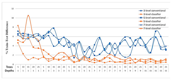 A brute-force simulation was performed to tune the hyperparameters of both the conventional classifier and the proposed random forest classifier. The training and testing loss function differences of both the conventional and the proposed classifiers are shown in Figure 5. Based on three-level cases, it can be observed that, most of the time, the proposed RF classifier has a lower train–test difference, indicating a better model performance to avoid overfitting compared to the conventional classifier. In addition, the proposed method tends to converge in less than 2% train–test loss function difference as the parameters increase, whereas the conventional method deviates. Furthermore, the average standard deviation on the classification accuracy of the proposed method is lower than the conventional one in all three cases, as shown in Table 2. Accordingly, the lower minimum and maximum standard deviations of the proposed method suggest a more precise prediction than the performance of the conventional method.
