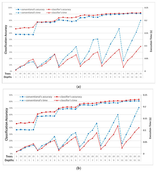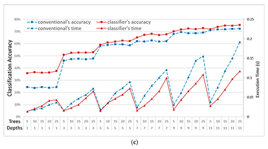 Parameter simulations of both the conventional and the proposed classifiers in three cases are compared in Figure 6a–c. This was conducted to determine the classification performance and the execution time of both methods as the respective parameters become more complicated. Both classifiers seem to perform better with lower energy levels. Both classifiers converge to a classification accuracy around 90% in three-level prediction in Figure 6a, while reaching around 83% and 75% for five- and seven-level predictions in Figure 6b,c, respectively. However, the proposed classifier is observed to outperform the conventional classifier based on a higher classification accuracy performance and a lower execution time in all three cases. Initially, the execution time of the proposed model takes almost the same time as the conventional one using simpler parameters. With the increasing complexity of the parameters, the former does not change significantly, whereas the latter changes abruptly. It seems that this is due to the fact that the conventional method has a regression model structure which is more complicated than the classification model of the proposed method. The performance of the conventional method approaches that of the proposed method in terms of classification accuracy at the expense of computation time.
