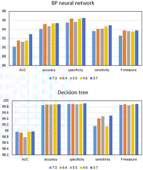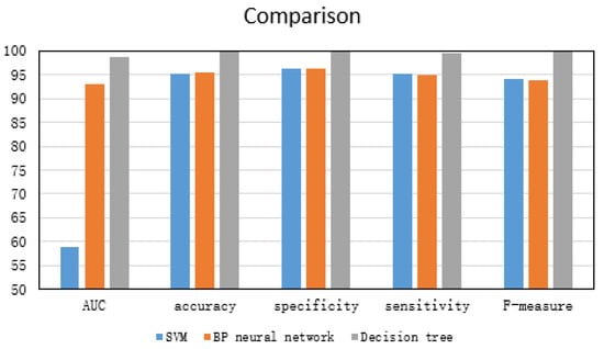 Dataset 5 was used to train and test three anomaly detection approaches, and the ratio between test set and training set was fixed at 3:7. The experimental results are shown in Figure 4. It can be seen from experimental results that the performance of three anomaly detection approaches is very excellent, and their detection accuracy is higher than 0.95. Of course, in comparison, each evaluation index of the detection scheme based on the decision tree is better than the other two schemes. Accordingly, two conclusions can be drawn, one is that the feature combination we choose is optimal; the other is that the detection performance of the decision tree is better than the other two methods.