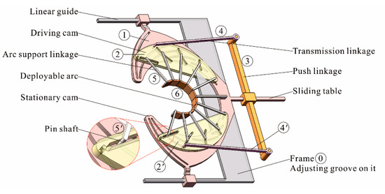 The deployable arc profiling mechanism presented in this paper is shown in Figure 1. The mechanism is made up of upper, middle, and lower three-layer plane. Multiple grooves are distributed in each cam. The upper layer consists of two driving cams, a deployable arc, and multiple arc support linkages. The middle layer consists of a stationary cam, a sliding table, a push linkage, and two transmission linkages. The lower layer consists of an adjusting groove and two linear guides. The lower layer is fixed on the machine frame. The middle layer is installed on the lower layer’s two linear guides. The upper layer is connected to the middle layer by using the push linkage and transmission linkages. One end of the transmission linkages is connected to the driving cams, and the other end is connected to the push linkage. The sliding table on the middle layer drives the push linkage to drive the mechanism. All the arc support linkages are connected to the deployable arc with hinges. The arc lengths between any two adjacent connection points are equal. The other end of the arc support linkages is connected to the two driving cams by using pin shaft. All the pin shafts are welded to its corresponding arc support linkages, and perpendicular to it. Among these pin shafts, there are two pin shafts symmetrically installed along the center line of mechanism and pass through three grooves of the upper, middle, and lower layers’ cams at the same time. The rest of the pin shafts only pass through two grooves of upper- and middle-layers’ cams. The mechanism is a plane motion pair composed of cam grooves. The deploying movement of the arc is driven by the interaction between the driving of push linkage and the relative motion of composite multi-cam. The final result of the movement is that the deployable arc can be deployed around a fixed arc center and achieve continuous change of the arc radius.