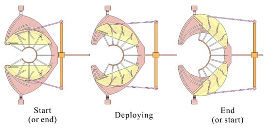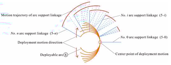 At this time, the rotation DOF of the driving cam is completely constrained by the motion positioning groove and the base point motion groove. We put pin shafts passes through these cam grooves corresponding to its serial number. The driving cam produces a relative motion with the stationary cam under an external driving force, their intersecting grooves interact to drives arc support linkages to move. Finally, the deployable arc can be continuously changed under the condition of maintaining its shape of an arc, and the mechanism has only one DOF, that is, the deployable arc can be deployed. A schematic diagram of the deploying process is shown in Figure 10.