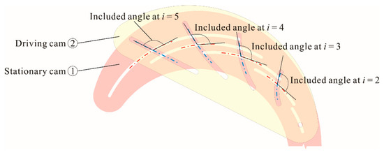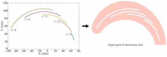 where r is the radius of arc, l is the length of support linkage, and c is the arc length of segmented arc. If r varies from 20 to 50 mm, l = 70 mm, c = 10 mm, and the number of support linkages (in the upper part) is 5. The pitch curve at the end of No. i (i = 1~5) support linkage and the upper part of the stationary cam are shown in Figure 4.