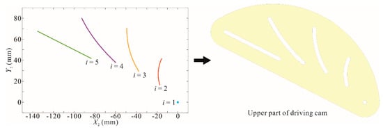 If r varies from 20 to 50 mm, l = 70 mm, c = 10 mm, j = 1, n = 5, and the straight line is Y = −X / 2. The pitch curve at the end of No. i support linkage and the upper part of driving cam are shown in Figure 6.