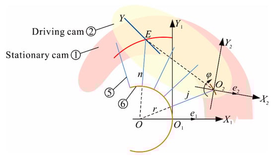 This section will present the motion equations of the driving cam, i.e., the translational trajectory of point O2 and rotational motion around point O2 on O1-X1Y1 plane, as shown in Figure 5. The trajectory of point O2 and point E on O2-X2Y2 plane can be expressed by Equation (3), then, i = j corresponds to point O2, and i = n corresponds to point E in Equation (3). Thus, the translational trajectory equation of point O2 (base point) on O1-X1Y1 plane is: