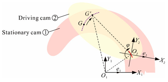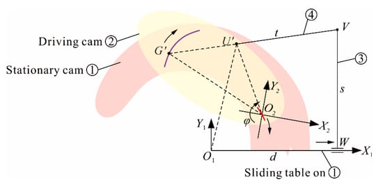If driving cam moves according to Equation (11), point G can form a projection trajectory on O1-X1Y1 plane. With the driving cam rotates φ angle according to Equation (14), the projection of point G moves to point G’ on O1-X1Y1 plane. According to coordinate transformation of Cartesian coordinate system, the coordinate of point G’ relative to O2-X2Y2 plane is: