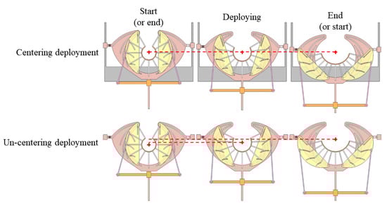 In this paper, we select the No. 1 pitch curve (i = 1 in Equation (17)) to design and produce adjusting groove. Make the pin shaft at the end of the No. 1 arc support linkage to passes through the No. 1 groove of the driving cam, stationary cam, and adjusting groove at the same time. Through the drive of the driving cam, the deployable arc profiling mechanism finally realizes the centering deployment around the circle center of the arc. Finally, the mechanism has two DOFs, one for deploying the deployable arc and the other for adjusting the deployment center. Figure 11 shows the difference between with and without adjusting groove, and a comparison of between centering and un-centering deploying motion.