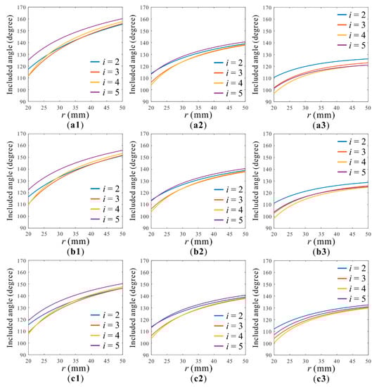 It can be seen from the figure that as radius r increase, the included angle increases gradually. From the horizontal comparison of diagrams (a1), (a2), (a3), (b1), (b2), (b3), and (c1), (c2), (c3) can be seen that with the value of b decreases, the included angle decrease. From the longitudinal comparison of diagrams (a1), (b1), (c1), (a2), (b2), (c2), and (a3), (b3), (c3) can be seen that the value of a has little effect on the included angle. In particular, when b = 0, the change in the value of the included angle is no longer affected by a.