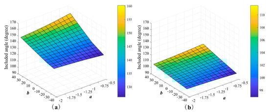 From the figure, we can see that if the value of b is small, the value of the included angle gradually decreases with the increase of a. However, if the value of b is large, the value of the included angle gradually decreases with the decrease of a. If b = 0, the value of a has no effect on the included angle. Before and after this value, the variation trend of included angle changes with the value of a has changed. If a is fixed, then the included angle always decreases with the value of b decreases. Comparing (a) with (b), the variation trend of the maximum value and minimum value are the same, but the change of maximum value is greater. Within the selected test range, the optimal parameter combination of included angle is a = −0.5 and b = −35. For these parameters, the maximum value of the included angle is 126.3° and the minimum value is 96.9°.