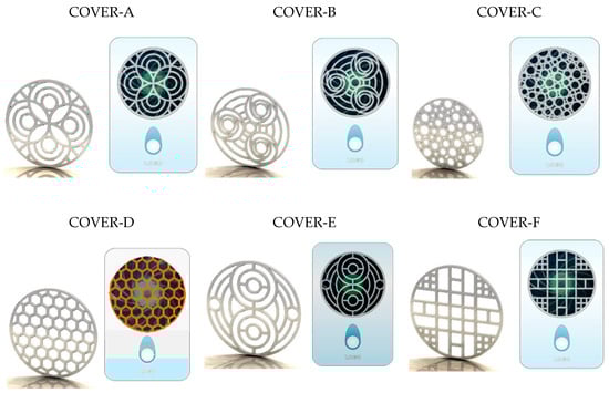 One of the most important factors that affect the flow rate of a fan is the opening pattern. In order to make the overall evaluation framework more complete, the parameters and curve equations that affect the fan performance should be considered when designing the blade profile. The conditions of the geometric shapes were listed, and the simulation results of the new fan models were compared with the real test results as shown in Figure 1. Therefore, after analyzing the fans that are available on the market, a variety of new fan grill designs were created in this study. These new grill designs were screened out according to the ergonomic design principle that human fingers do not penetrate the grill gaps. Moreover, the qualified designs need to present symmetric and regular curve patterns. A total of six grill patterns were determined to be the qualified ones and were analyzed by CFD simulation in order to determine the most optimal fan grill design. The geometric parameters of the new fan blade designs are shown in Table 1. Of all the new opening pattern designs, six were selected for further simulation. The six different opening pattern designs are shown in Figure 2 as follows.