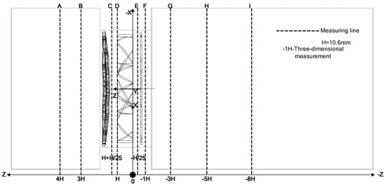 The purpose of this study was to investigate the design of the opening patterns. A fan rotates to move air to the opening, and the domain of the upstream and downstream of the fan should be included into the numerical simulation to obtain more accurate numerical results. The symmetric air velocity measurement points on the fan model is shown in Figure 3. Along the centerline of the fan model, there were a total of nine measurement points marked as Points A to I, among which Points C to F were the points located within the fan itself. Points A and I were located at the inlet and outlet of this flow field to determine the flow pattern of the region close to the opening. The velocity component V can be determined as these points are located at the boundary of this solution domain. The velocity along the vertical axis can be obtained from the numerical analysis and can be later compared to the real measurement results. The numerical model was based on the standard k–ε model. The vertical component V indicates a larger difference than the component along the flow direction. This is the main purpose of optimizing the opening pattern design in order to obtain satisfactory results.