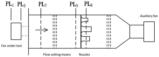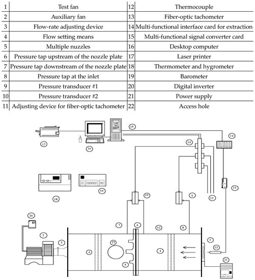 From the aspect of performance measurements in this experiment, the detailed configuration of the measuring equipment and apparatus and the corresponding operations were described separately as shown in Figure 4. The main device of the performance testing equipment for the fans used adopted the outlet-chamber wind tunnel according to the AMCA 210-99 standard. This type of wind tunnel is composed of a main body, flow setting means, multiple nuzzles, and a flow-rate regulating device []. Its major function is to simulate various types of the air-flow condition downstream of the fan and supply a good and stable flow field for measurement in order to obtain the complete performance curves [].