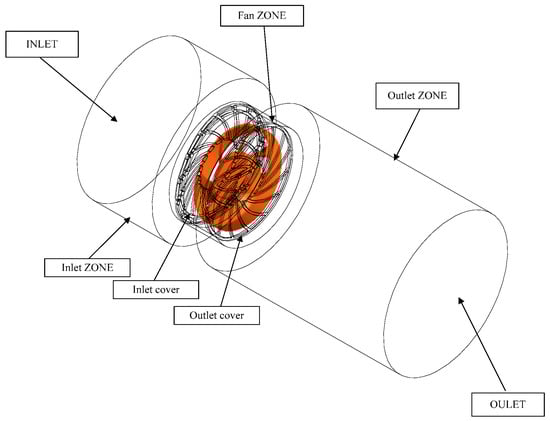 The dimension of the target fan model was 35 mm (L) × 95 mm (W) × 146 mm (H), as shown in Figure 1. The main components of the external structure included a casing or housing, impeller, and exhaust housing. A fan operates by creating a pressure difference by the rotating blades so that the surrounding fluid is forced to move. Therefore, its energy is transferred to the surrounding fluid in a dynamic way. The main effect is to overcome the system impedance by the air pressure that is created by the fan.