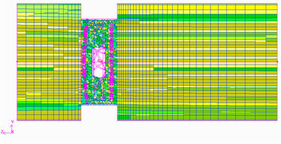Mesh structure along the cross-section of the numerical model of the axial fan.