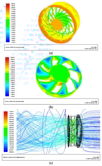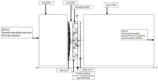After the completion of the numerical simulation, we compared the results to the experiment in order to determine whether the trend corresponded to each other. Furthermore, the accuracy of the numerical simulation in this study was also verified as shown in Figure 9. First, to verify the accuracy of the numerical simulation, it is known from the comparison of the numerical results to the experimental ones in Table 5 that the numerical results were on average 3% smaller than the experimental ones. After exploring the reason, it was found that the deviations occurred most from the difference between the configuration of the real test environment and that of the simulated environment. This is due to the fact that when testing a real fan, the air impedance varies according to different operating points. It is also known from the experimental results that the average fan speed during the real tests was 3% larger than the design fan speed, so that it could be closer to the real test result [].
