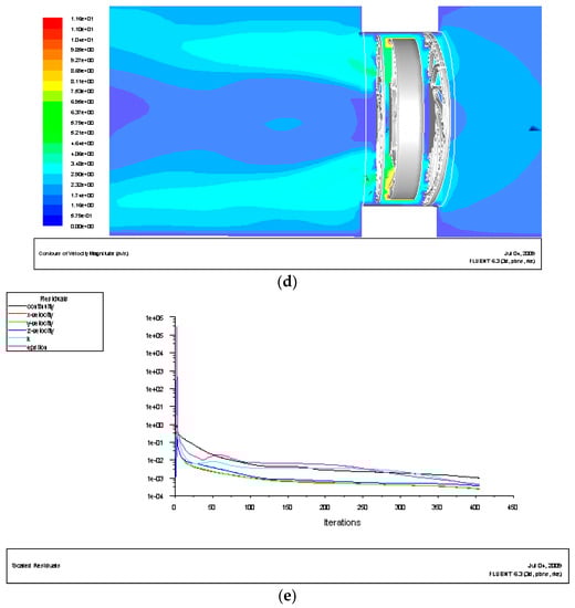 Resulting plots of CFD simulation for the numerical fan model. (a) Pressure distribution on top and bottom covers; (b) pressure distribution on the fan; (c) distribution of stream lines; (d) distribution for flow field; and (e) program convergence plot.