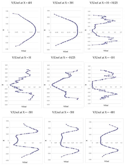 Non-dimensional velocity V/Uref at nine planes along the vertical centerline of the model for the numerical simulation.