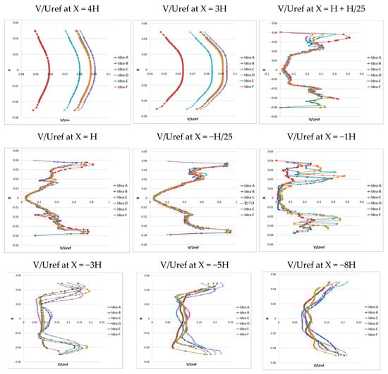 Figure 11 indicates the non-dimensional velocity V along the vertical direction from A to I. Since the air flow rate of a fan is affected by the gaps at the outlet, the relative location of the intake channel is different according to its air velocity. The velocity component of the six curves on 4H in Figure 11 was consistent with those in Figure 10. The velocity component V at 10 mm in front of the fan was almost uniform. The variation in the air velocity was due to the interference of the direction of the rear gaps. At a distance of −1H, the velocity started to vary and the change in the air velocity was in the same direction. A similar trend could be observed at the eight vertical lines at the rear end of −3H. The V component was larger at both the left and right sides and was negative at the centerline of the fan. It is known that the magnitude of the velocity component at −5H is relatively smaller than the left and right sides. The results also indicated that the velocity component of the Idea-D magnitude remained at the highest air velocity from the measurement line between E and I. Under this condition, the boundary layer effect of the velocity component could be clearly observed. The magnitude of the velocity component was gradually increased and the Idea-D can be viewed as the optimal factor of the opening pattern design.