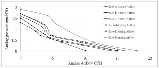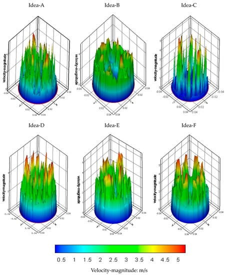 Figure 12 indicates the qualitative velocity distribution on the three-dimensional plane at location F of the outlet opening. The purpose of this figure is to understand the velocity pattern on these six planar regions. As the results clearly indicated a cone-shaped distribution, the velocity distribution at the outlet region was the most apparent. Moreover, Figure 12 also indicates that the out ring of the distribution of Idea-C revealed a low air velocity. In contrast, the air velocity at the peak was the highest. The Idea-D had the largest number of peaks and this indicates that this region was the region with the highest air velocity and the distribution had a more focused region in the central region. For the velocity distribution of Idea-B, E, and F, since they were affected by the non-uniform gaps, the air flow velocity was reduced. When the fan was rotating, the air layers also rotated. The air at the central region was affected by the viscosity and molecular attraction, so the rotating effect was transferred to the air on the out ring of the flow field.