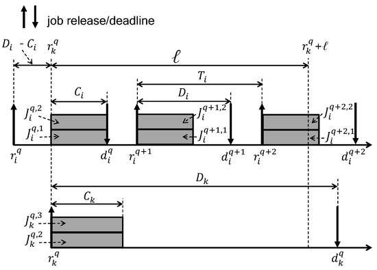 as shown in the lower part of Figure 2. As seen in Figure 2, times of and times of can contribute to . In addition, because a job cannot execute in a time instant if m other higher priority jobs execute, using upper-bounded and , is upper-bounded by
