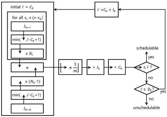 The remaining issue is to find a value of ℓ and an upper bound . RTA for TL-NMR works as follows. Initially, ℓ is set to and RTA tests whether the inequality holds. If the inequality holds, the task is deemed schedulable. Otherwise, RTA resets ℓ to the previous value of the LHS of the inequality, until the inequality holds or ; represents that is deemed unschedulable. If the inequality holds, is deemed schedulable and the value of ℓ satisfying the inequality is , i.e., holds.