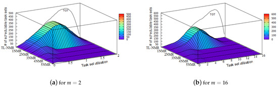 - TL-NMR-RM maintains the same performance in schedulable ratio (i.e., the number of task sets deemed schedulable) compared to 1MR-RM for both and 16 (Figure 5a,b),