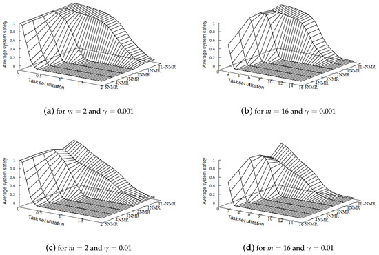 In this section, we evaluate the performance of the proposed TL-NMR compared to that of the existing fault-tolerant techniques. For performance metrics, we measure the number of randomly generated task sets that are deemed schedulable (called schedulable ratio) and the average of considered task sets’ system safety (called average system safety). Task sets for our evaluation are randomly generated based on a popular task set generation method that has been exploited in a number of existing studies regarding real-time scheduling [14,15,16]. The task set generation method used in our study has two parameters such that the number of processors and the input parameter or for individual task use () distribution. If is given, a value for is uniformly selected in [0, 0.5) and [0.5, 1) with probability and , respectively, according to a given bimodal distribution. On the other hand, when is given, the value is selected according to the exponential distribution whose probability density function is . Then, the parameters of a task in a task set are determined as follows. is uniformly determined in , is chosen by the bimodal or exponential parameter with already determined, and is uniformly chosen in . Ten thousand task sets are randomly generated for each value of m.