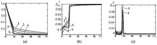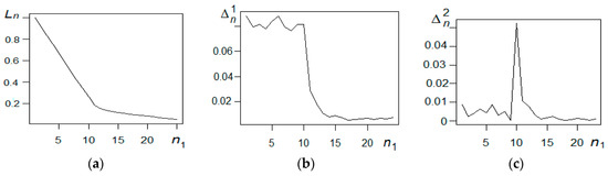 Results of application of the adaptive pendular algorithm to truncation of internal outliers: (a) Dependence of the statistic Ln on the number of truncated observations, (b) dependence of the statistic on the number of truncated observations, and (c) dependence of the statistic on the number of truncated observations.