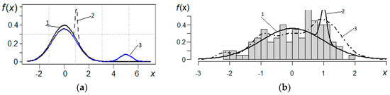 is the bandwidth parameter, and is the kernel function. The standard normal distribution density (curve 1), the standard normal distribution density with internal outliers (curve 2), the Rosenblatt–Parzen density estimator (curve 3), and the histogram (N = 100 and ) are shown in Figure 3.
