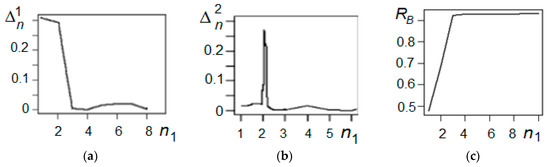 The outliers seriously worsen the situation. Without outliers, RS = 0.91, and the criterion unambiguously rejects the zero hypothesis, but in the presence of two outliers, RS decreased by more than twice, down to RS = 0.42, and the criterion unambiguously accepts the zero hypothesis. Figure 5 shows the results of application of the APT algorithm for N = 18 + 2 outliers depending on the number of truncated observations n1. From Figure 5c, it can be seen that the algorithm detects and selects 2 outliers.