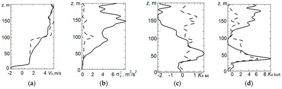 Vertical profiles of four moments of the x-component of the wind velocity retrieved from minisodar measurements in the morning (from 07:00 till 07:10, local time) using the standard minisodar data processing algorithm [23] (solid curves) and the adaptive pendular truncation algorithm (dashed curves): (a) Average Vx values, in m/s; (b) variances, in m2/s2; (c) skewnesses; and (d) kurtoses.