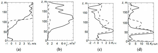 Vertical profiles of four moments of the y-component of the wind velocity retrieved from minisodar measurements in the morning (from 07:00 till 07:10, local time) using the standard minisodar data processing algorithm [23] (solid curves) and the adaptive pendular truncation algorithm (dashed curves): (a) Average values, in m/s; (b) variances, in m2/s2; (c) skewnesses; and (d) kurtoses.