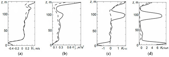 Vertical profiles of four moments of the z-component of the wind velocity retrieved from minisodar measurements in the morning (from 07:00 till 07:10, local time) using the standard minisodar data processing algorithm [23] (solid curves) and the adaptive pendular truncation algorithm (dashed curves): (a) Average values, in m/s, (b) variances, in m2/s2, (c) skewnesses, and (d) kurtoses.