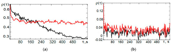 Using the APT algorithm, censoring of the samples was performed to obtain estimates of the autocorrelation and structure functions. As an example, Figure 9 show the dependences of the autocorrelation function ρ(τ) of the x-component of the wind velocity on the lag τ retrieved from minisodar measurements at the indicated altitudes in the morning, and Figure 10 show the corresponding dependences of the structure functions St(τ) in m2/s2. The red curves here show the results of calculations for the full sample, and the black curves show the results of calculations for the truncated sample using the APTA.