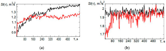 The structure function at an altitude of 35 m (Figure 10a) behaves in the classical manner, and even better for the censored sample. Here, the inflection point of the dependence is observed at 160–280 s with its subsequent saturation. At an altitude of 175 m (Figure 10b), the structure function acquires large values, and for the censored samples, it remains on average unchanged with the lag. It is natural to suggest that the results of measurements with increasing sounding altitude are more strongly influenced by noise that has an uncorrelated character [3,4] and lead to the occurrence of false outliers.