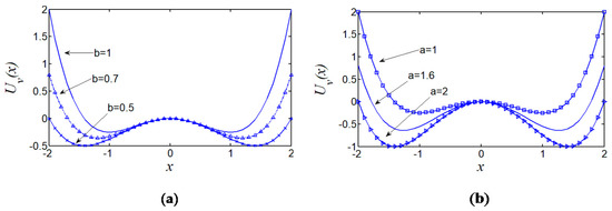 where a and b are real positive values. Figure 1 shows the fixed parameters a or b, respectively, in order to analyze their influence on the potential barrier and the potential well.