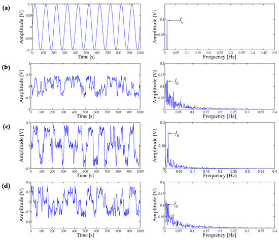 Set the other parameters of the signal as follows: The sampling frequency is fs = 5 Hz and the length of the signal N = 5000. The time domain and amplitude spectrum of the signal without noise are shown in Figure 5a. Here, given a set of parameters that can produce SR, a = 0.4, b = 2.7, V = 11, r = 39, c = 20, and k = 0.47. The time domain waveform and amplitude spectrum of the STSR output signal are shown in Figure 5b when D = 0.3, and the frequency 0.01 Hz cannot be seen. Further, adding noise to the input signal, as the noise increases, STSR obtains the output signal, as shown in Figure 5c when D = 0.5. The time domain waveforms can see obviously periodic components, and spectral peaks appear at 0.01 Hz in the amplitude spectrum. When the noise D = 0.8, and the frequency 0.01 Hz cannot be recognized from Figure 5d. It is found that the signal amplitude at the noise intensity D = 0.5 is higher than the amplitude of the signal without noise comparing Figure 5c and Figure 5a. It shows that, as the noise increases, the characteristic components of effective signal increases greatly. On the other hand, the energy of the noise transfers to the signal. However, the characteristic components of signal attenuate, while the noise increase further, which is a typical feature of the SR system.