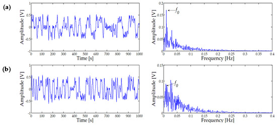 Then, we explore the effect of damping ratio k on the STSR performance. In the same way, we use the signal of Equation (8) as the input of STSR to analyze the influence of k on the output signal. We cannot see the 0.01 Hz from Figure 5b, when D = 0.3, a = 0.4, b = 2.7, V = 11, r = 39, c = 20, and k = 0.47. We can fix parameters a, b, V, r, c, and make k = 0.5334, seeing 0.01Hz clearly from Figure 6a that shows the result of STSR. When the damping ratio k is increased to 0.885, the time-domain waveform and amplitude spectrum of the output signal are as shown in Figure 6b. The 0.01 Hz cannot be discerned from the amplitude spectrum. The signal with noise intensity D = 0.8 is analyzed to fully explain the effect of damping ratio k on STSR. When the damping ratio k = 0.47, the characteristic frequency of 0.01 Hz cannot be recognized from the amplitude spectrum of Figure 5d. Figure 7a displays the time-domain waveform and amplitude spectrum of STSR output signal when k is decreased to 0.375. It can be observed that 0.01 Hz is very obvious in the whole amplitude spectrum, although there are many frequency components in the whole spectrum. Continue to reduce the damping ratio k to 0.235, and the time-domain waveform and amplitude spectrum are as shown in Figure 7b, from which the frequency of 0.01 Hz cannot be observed. Thus, the damping ratio k affects the characteristics of the STSR system.