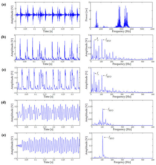 Analysis results with outer-race fault signal: (a) Original signal and its power spectrum; (b) envelope signal and its amplitude spectrum; (c) CSR output signal and its amplitude spectrum; (d) USSSR output signal and its amplitude spectrum; and (e) STSR output signal and its amplitude spectrum.