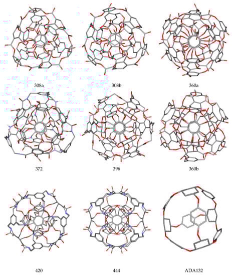 The last group of considered nanosytems, namely cube rhombellane homeomorphs, showed the lowest binding capacity relative to the ligand molecule. A large group of proposed compounds exhibited satisfying binding affinity towards the ligand molecule. The binding capacity of these nanostructures is strictly related with the structure of the external shell of these molecules. The example of molecules 360a and 360b clearly shows that two structural isomers can exhibit significant differences in this field.