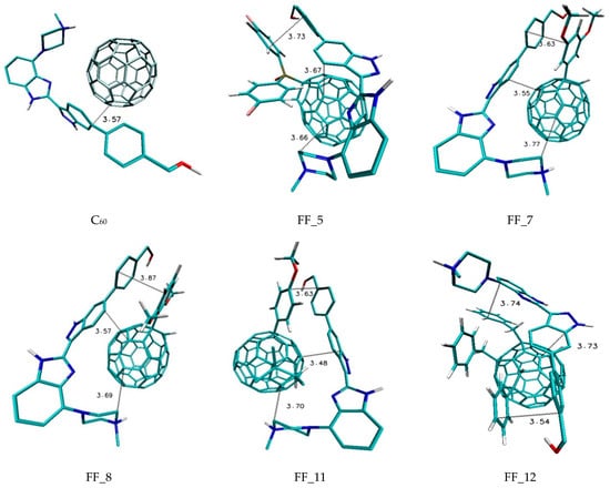Graphic representation of ligand complexes with functionalized derivatives of C60 fullerene characterized by highest binding affinity.