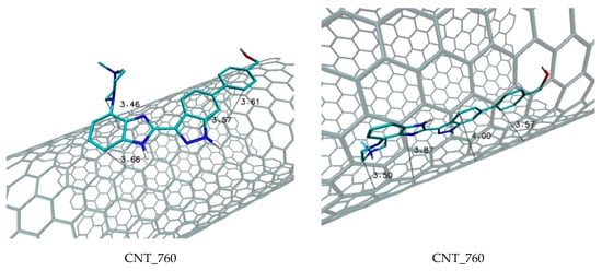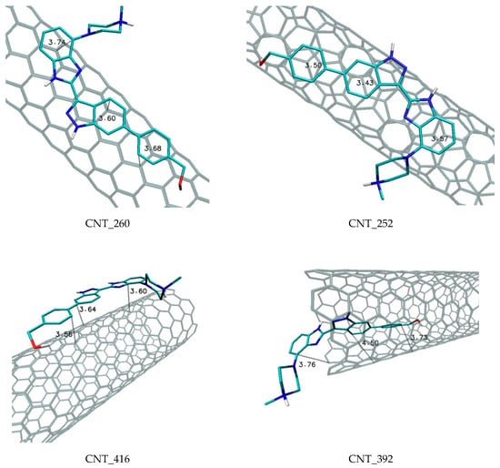 Increasing nanotube diameter and the related reduction of their surface curvature clearly affected the affinity relative to the ligand molecule. For each change of nanotube diameter from ~6Å to ~11 Å and to ~17 Å, simultaneous increases of binding affinity by about −1 kcal/mol were observed. In the case of two classes of nanotubes characterized by higher diameter values, the type of nanotube did not influence the affinity toward the ligand. Another situation was observed for nanotubes characterized by the smallest diameter values, as in this case, differences in affinities of particular types of nanotubes occured. Relatively large nanotube surface curvatures preferred the “armchair” type, which exhibited the highest affinity toward the ligand molecule. Differences of about −0.4 kcal/mol relative to other types of nanotubes indicated that the binding constant for that complex was twofold higher. The structures of the ligand molecule complexes with the chosen nanotubes are presented in Figure 5. In the case of systems where the ligand molecule interacted with the surface of the nanotube, a longitudinal orientation of considered molecules was always observed, regardless of the diameter of the nanotube. This orientation was dominant for all considered complexes. The planar orientation of the ligand molecule in all complexes and distances placed in the range from 3.43 to 3.74 Å caused all aromatic systems of the ligand molecule to be involved in creation of stable stacking interactions with the surfaces of the nanotubes used. The next analyzed aspect is related to interaction of the ligand molecule with nanotube interior. In this case, only two classes of nanotubes supported a sufficient diameter for this goal (~11 Å, ~17 Å). The data presented in Table 3 show that nanosystems with a smaller diameter (D2) interacted with the ligand molecule much more strongly, and the differences in binding affinities between the compared systems were in the range of −0.7 to −0.9 kcal/mol. The structures of complexes created by two compared classes of nanotubes were also significantly different (Figure 5). In the case of class D3, linearly arranged ligand molecule interacted with an internal nanotube surface, while in the case of class D2 nanotubes, centrally located ligand molecules could interact with the upper and lower plane of the molecule with nanotube walls. Additionally, the presence of aliphatic cyclic systems did not allow for an energetically favorable conformation to be obtained completely localized inside the nanotube. This part of the ligand interacted with the edge of the nanotube.
