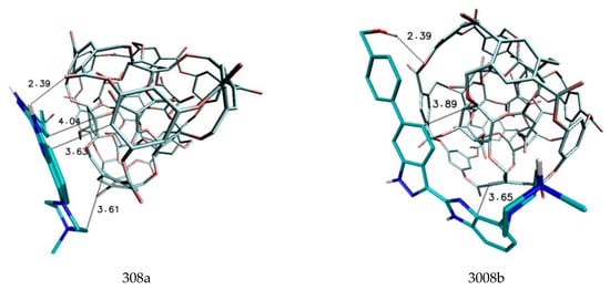The next structures exhibiting significant affinity toward the considered ligand were the isomers of molecule 308 (a, b). The binding affinity for both structures reached values of at least −1.6 kcal/mol higher than for the reference molecule. In both cases, the ligand molecule was involved in stacking interactions by the second and third aromatic system. One hydrogen bond was also observed in both complexes, namely, in the case of molecule 308a, it was a weak interaction created by hydrogen H3, while another weak interaction was created by hydrogen H1 in the case of molecule 308b. All discussed interactions can be observed in Figure 6.