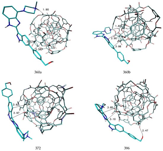 The last two systems that are worth discussing are molecules 372 and 396, both of which exhibited similar binding affinity towards the ligand molecule equal to −6.1 kcal/mol. The complex of the former was stabilized by only one stacking interaction, occurring between the second aromatic ring of the ligand molecule and one of aromatic modules from nanocarrier external shell, and one weak hydrogen bond which was localized between hydrogen H3 and the oxygen from the amide group of the nanomolecule. The characteristics of interactions stabilizing the complex of molecule 396 were quite similar; in this case, the third aromatic system of the ligand molecule was involved in stacking interactions, along with one weak hydrogen bond, created by hydrogen H1.